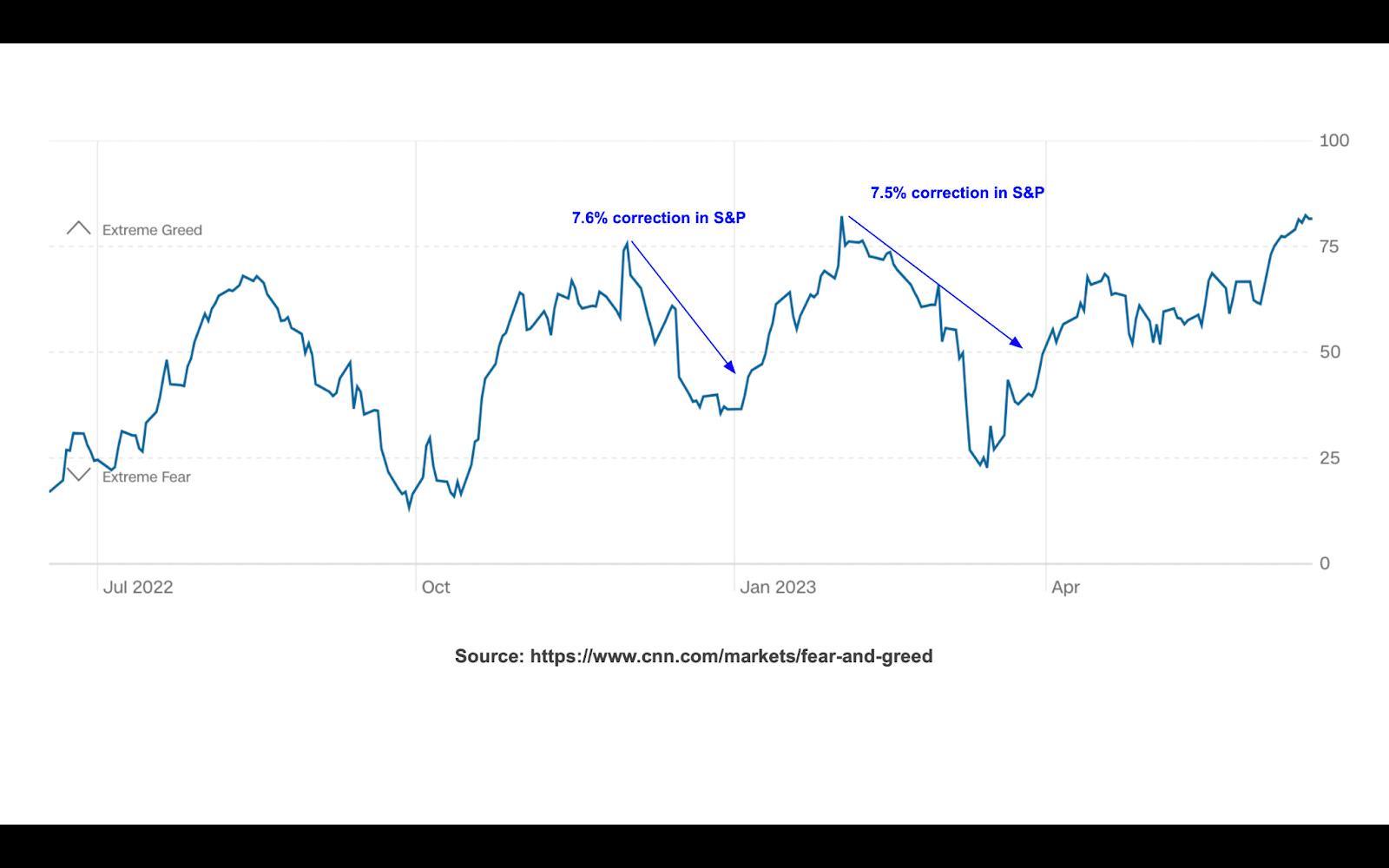The CNN Fear & Greed Index is now at 82, which corresponds to extreme greed. The last time the index closed above 80 was on February 1, just before a 7.5% correction.