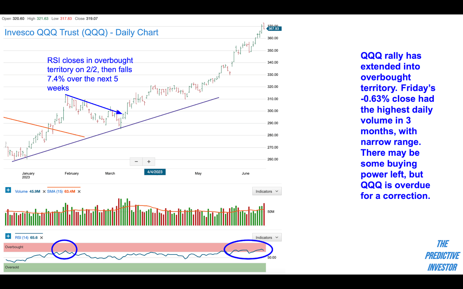 QQQ has been in overbought territory for the better part of the past month, making a correction increasingly likely. We would like to see a healthy 7%-10% pullback before adding additional positions to the portfolio.