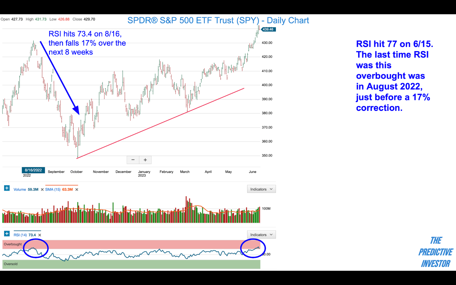 SPY is looking overextended over the short term. RSI is now in overbought territory for the first time since the August 2022 high. We will continue to be cautious about adding positions to the portfolio until we get a pullback.