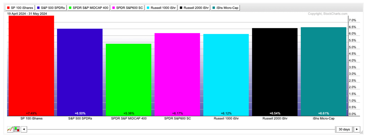 Since the market bottomed on April 19th, small and micro cap stocks have pulled ahead of the S&P 500. Utilities have also pulled ahead of Tech. We see this as an early sign that the rally is starting to broaden out beyond big tech.