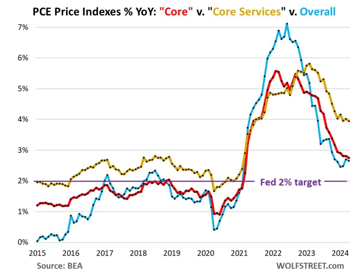Headline inflation was in line with expectations, but core services remains elevated far above the Fed’s 2% target. Core services comprises the majority of consumer spending, including housing, healthcare, insurance and entertainment. This data gives the Fed very little reason to lower rates. Translation = higher for longer.
