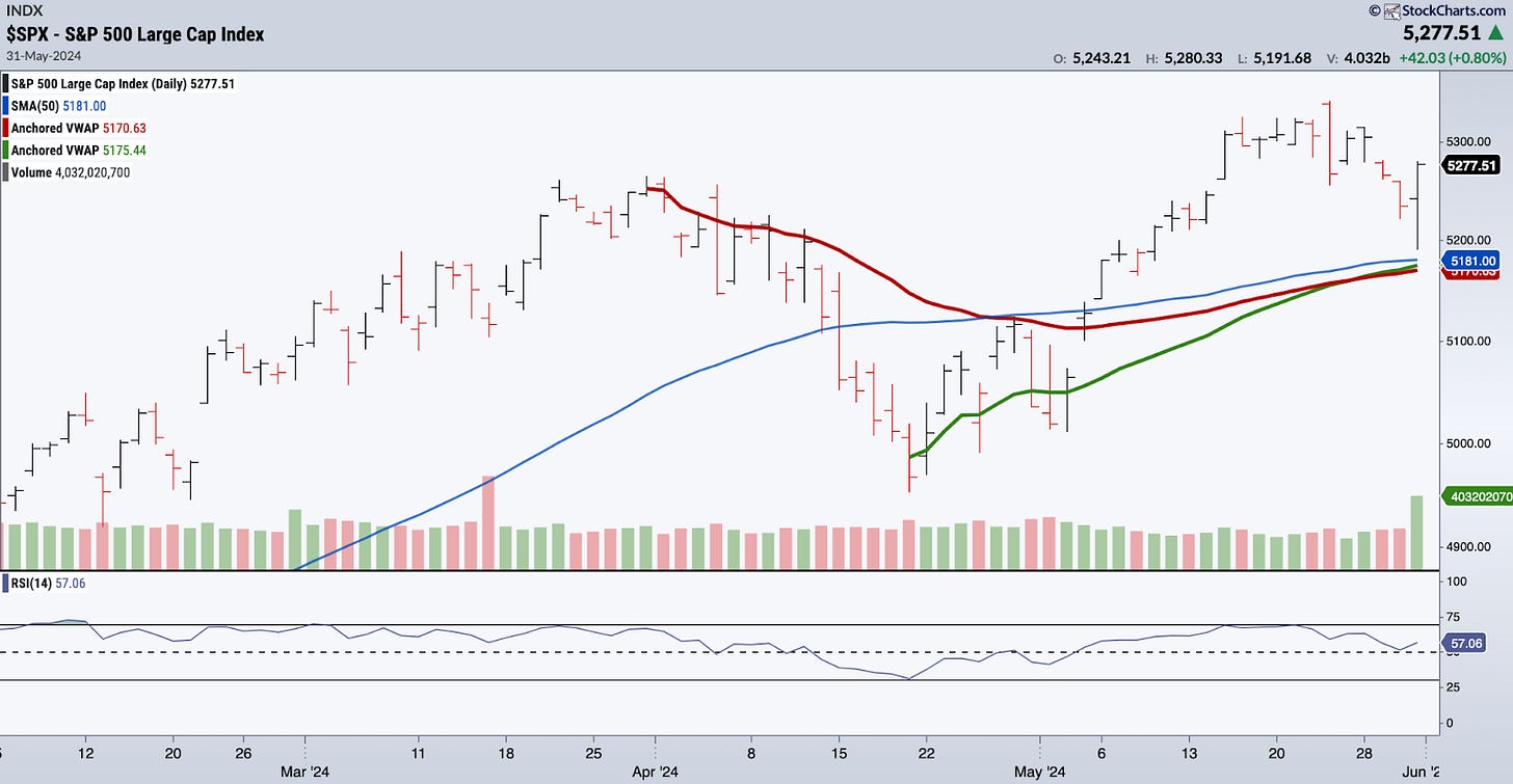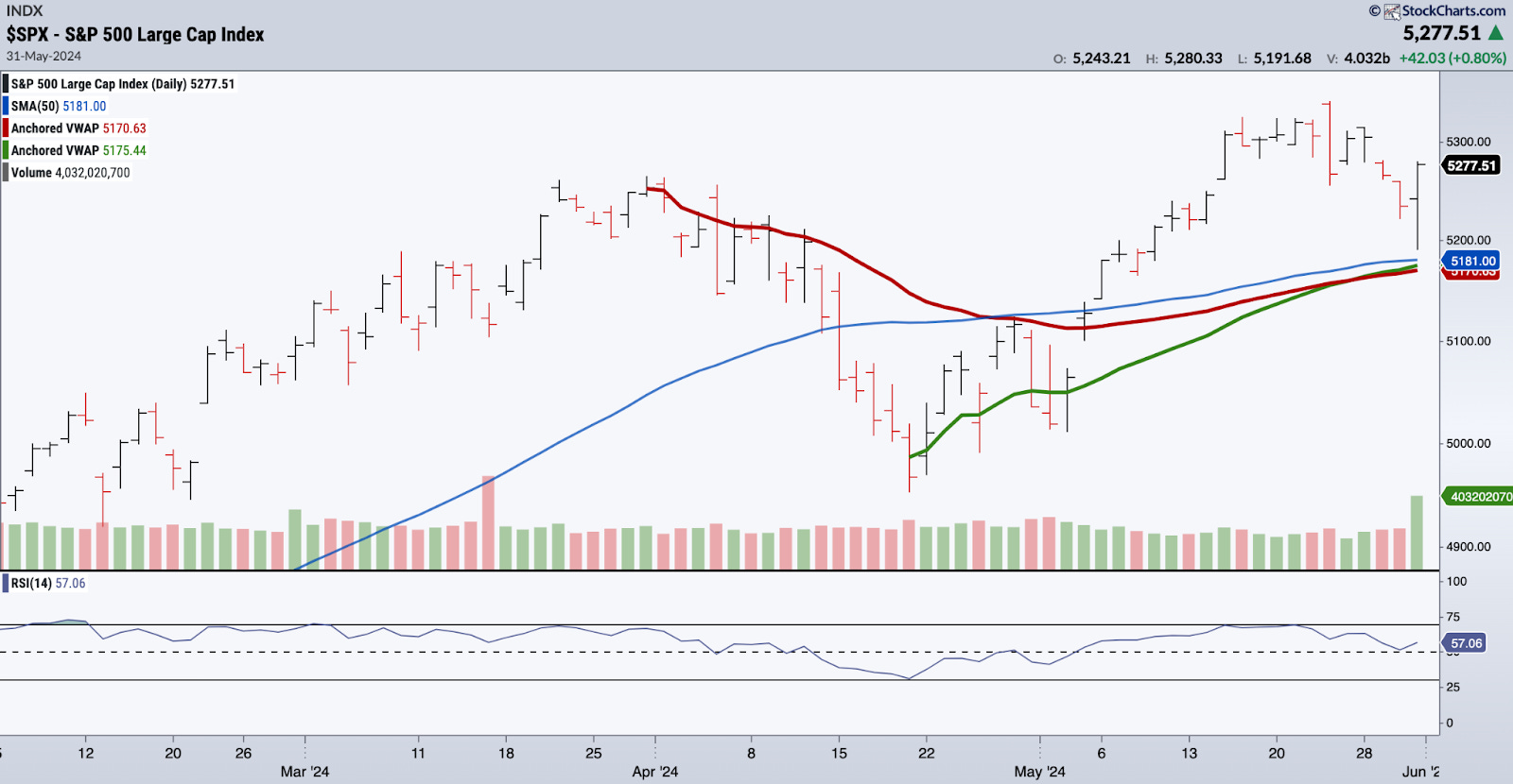 The SPX closed the week with a bullish reversal bar on high volume, bottoming near the 50-day moving average. While the 50-day has not been a stopping point in the recent past, this level coincides with the convergence of the 3/28 and 4/19 AVWAPs. Therefore we think this is an important short-term support level. June is seasonally weak for the market, but we’ll need to hold this level to see a sustained advance through the summer.