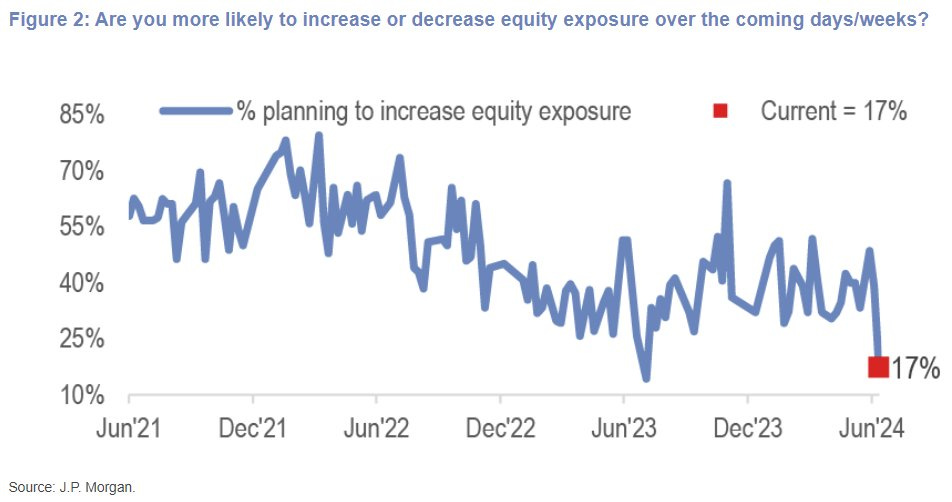 The latest J.P. Morgan survey shows very little interest among institutional investors to increase equity exposure. This is the most hated bull market in recent memory.