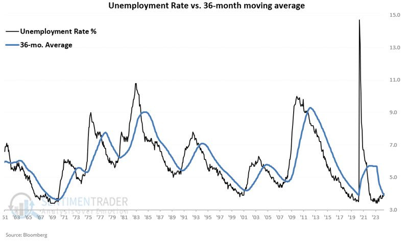 Which is why we found the below analysis from Sentimentrader curious. The unemployment rate has just crossed above its 36-month moving average, indicating a possible change in trend.