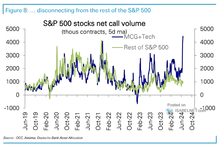 Not to mention the fact that there is historic optimism for mega cap tech. Call volume for mega cap growth and tech is significantly higher than the rest of the S&P 500, and above the level when the market peaked in 2021. Mega cap growth continues to be a very crowded trade.