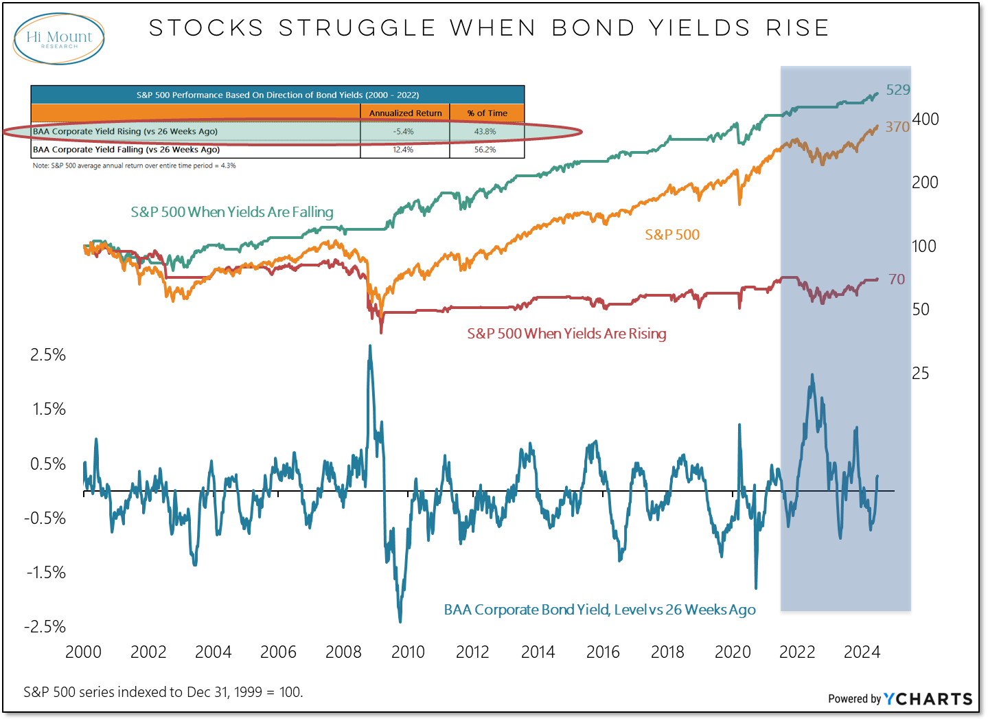 Here's a great chart that illustrates why we’ve been so focused on the direction of yields. Almost all of the net gains in the SPX have come when the 6-month momentum in corporate bond yields was falling. Low yields allow traders to take on more leverage, borrowing at low rates and investing in equities. Outside of geopolitics, interest rates remain the biggest risk for the market.