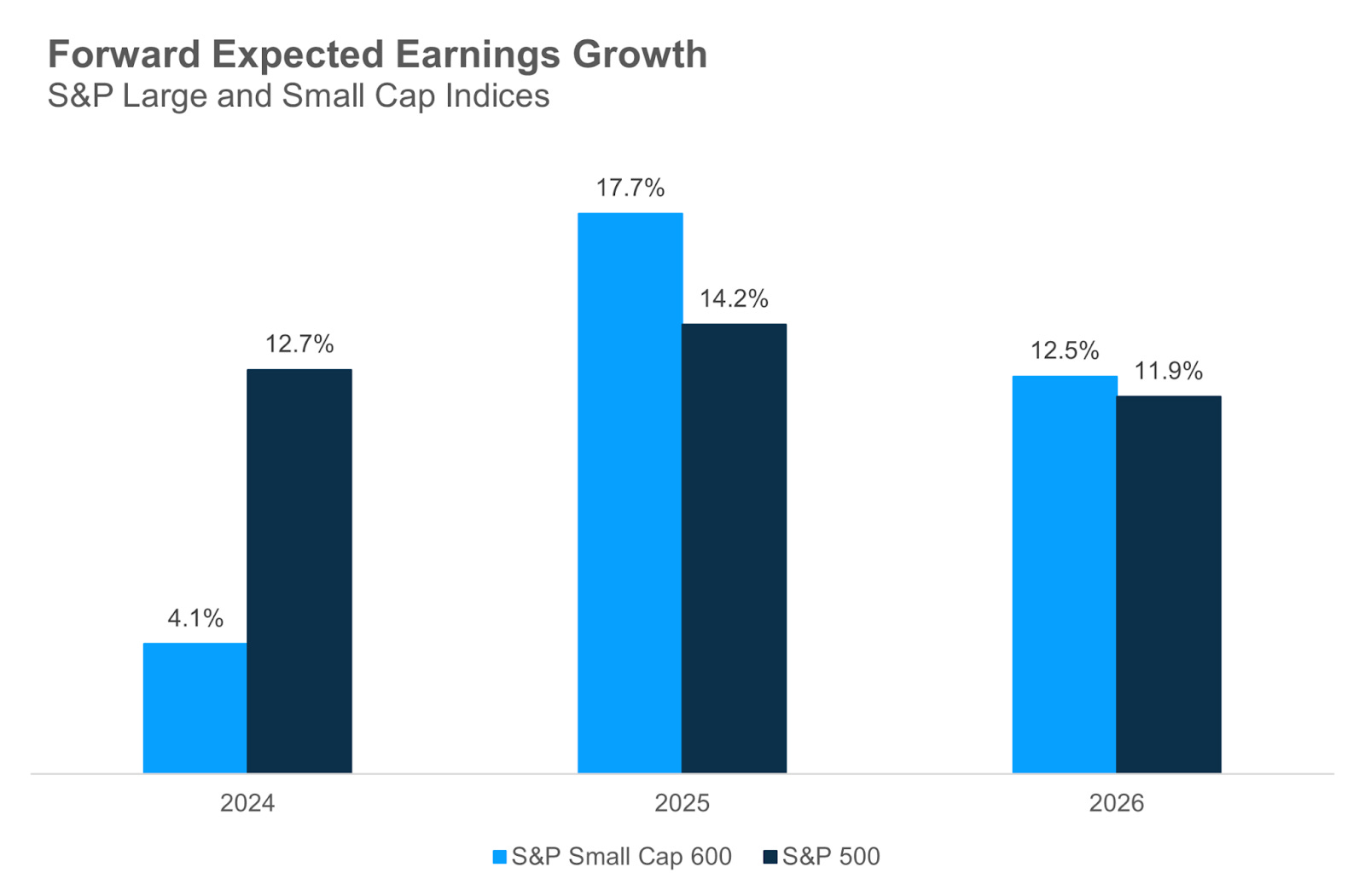As you know, stock prices are driven by earnings. And while mega cap growth has been pulling the market higher, that may be about to change. Forward expected earnings growth for small caps is above that of large caps over the next two years. As the effects of government stimulus to reshore supply chains and upgrade our infrastructure continue to work their way through the economy, we continue to believe small caps are set for explosive growth.