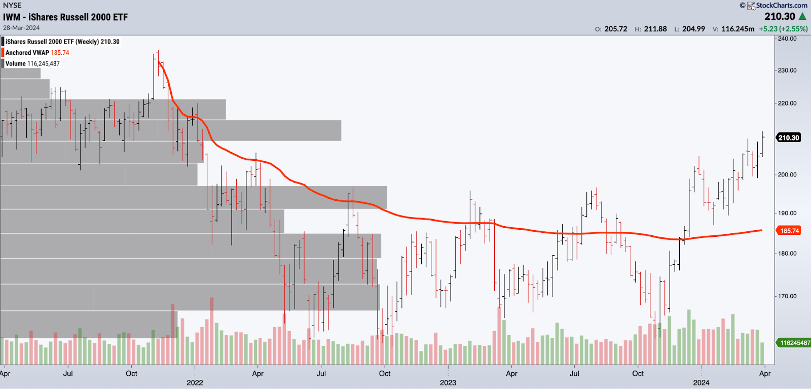 The small cap index closed the week at a two-year high, and the volume-weighted price since the top in 2021 has been trending up since December. We are watching the index closely, as $210-$215 is the last area of major price resistance. Clearing that range will mean the bull market is finally ready to broaden beyond mega cap tech.