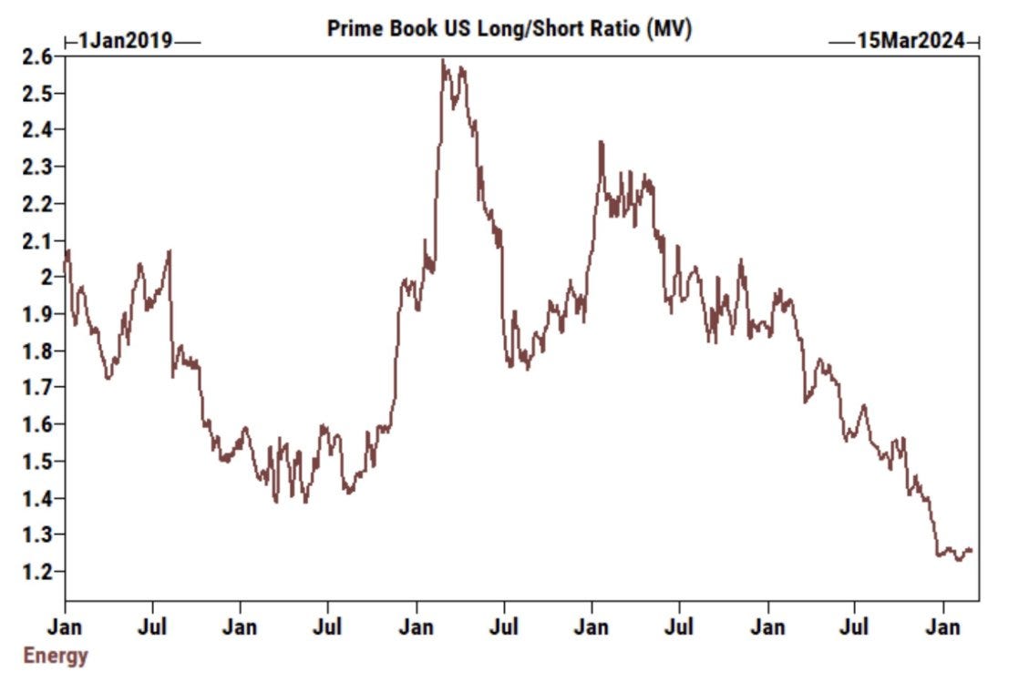 Despite the favorable fundamental backdrop, institutional investors have overlooked the sector. In fact, hedge funds are the least long in energy stocks in five years (chart below).