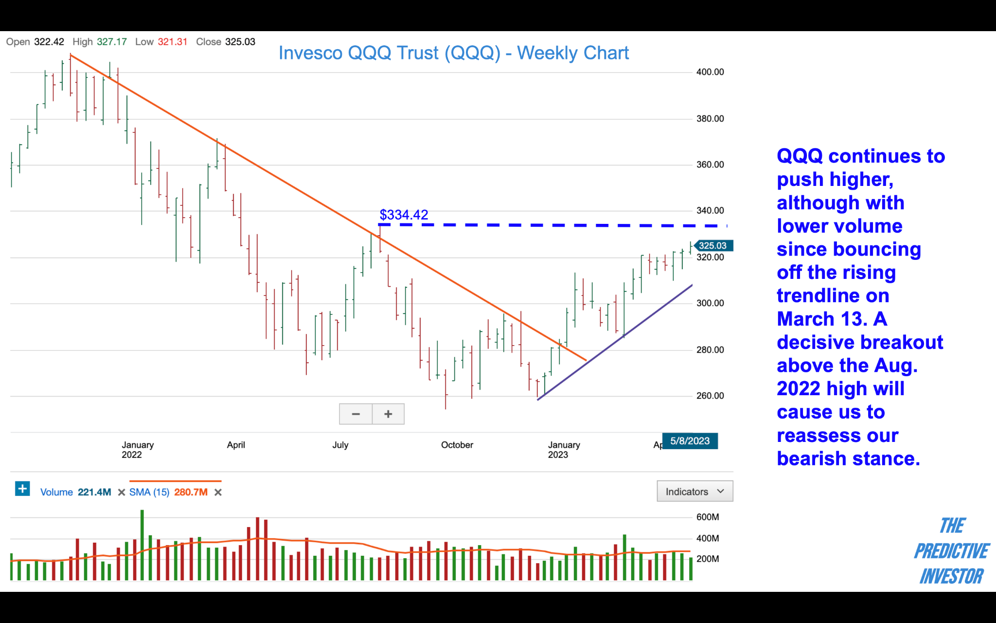 QQQ continues to push higher, and the real test will be if it can take out its August 2022 high of $334.42. The Dow briefly traded above its August 2022 high in December, but then failed to hold it. SPY has not yet traded above its high of last summer.