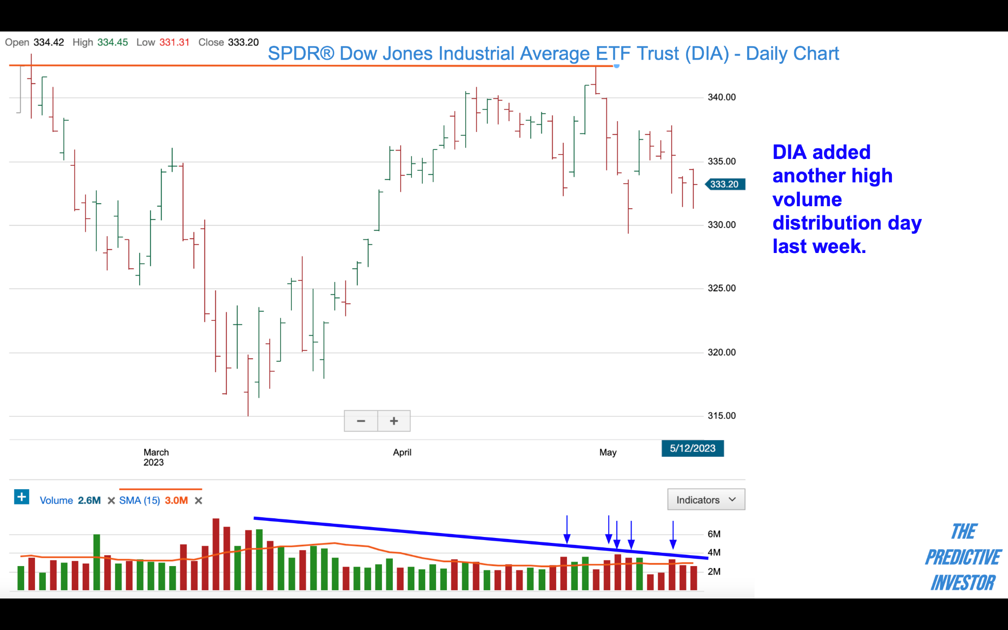 While the Nasdaq is slowly working its way higher, the Dow is slowly working its way lower. DIA added another high volume distribution day last week, and more Dow stocks are breaking down than making new highs. A breakdown below $330 will confirm the long-term bearish trend remains intact.