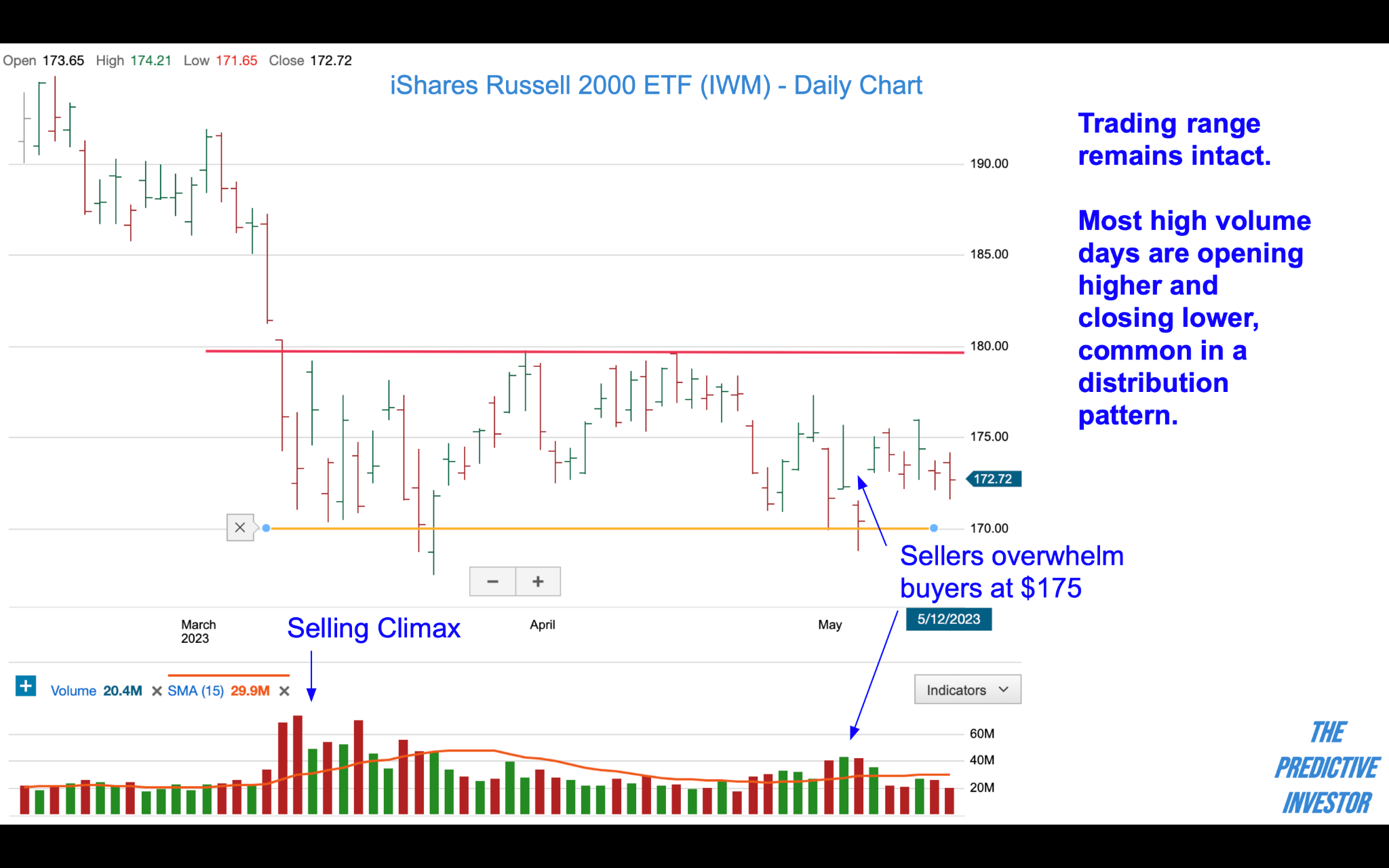 IWM remains in a trading range since the selling climax in March. While it does appear there’s been some accumulation of shares at $170, there is more selling volume at 175. Neither buyers nor sellers are in control of this market. We’ll be looking at price and volume activity at $170 and $180 for indications of a trend change. Until then we remain neutral.