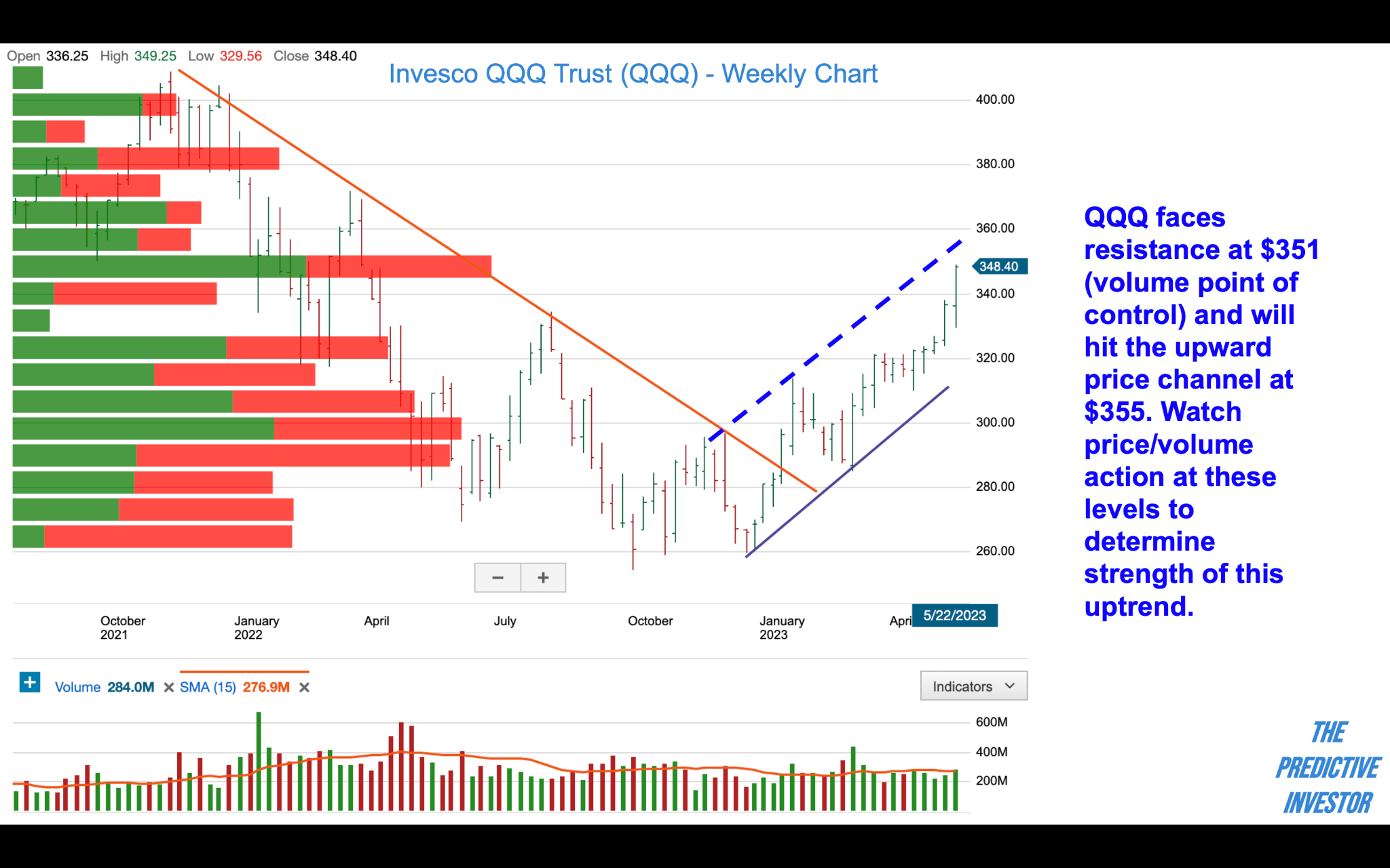 Thanks to blowout earnings from Nvidia, the Nasdaq closed the week up 2.5%. With an imminent deal to resolve the debt ceiling, this momentum is likely to continue. But June is seasonally a very weak month for tech stocks. We’ll be watching price and volume action closely in the $350-$355 range to assess the continued strength of this rally.
