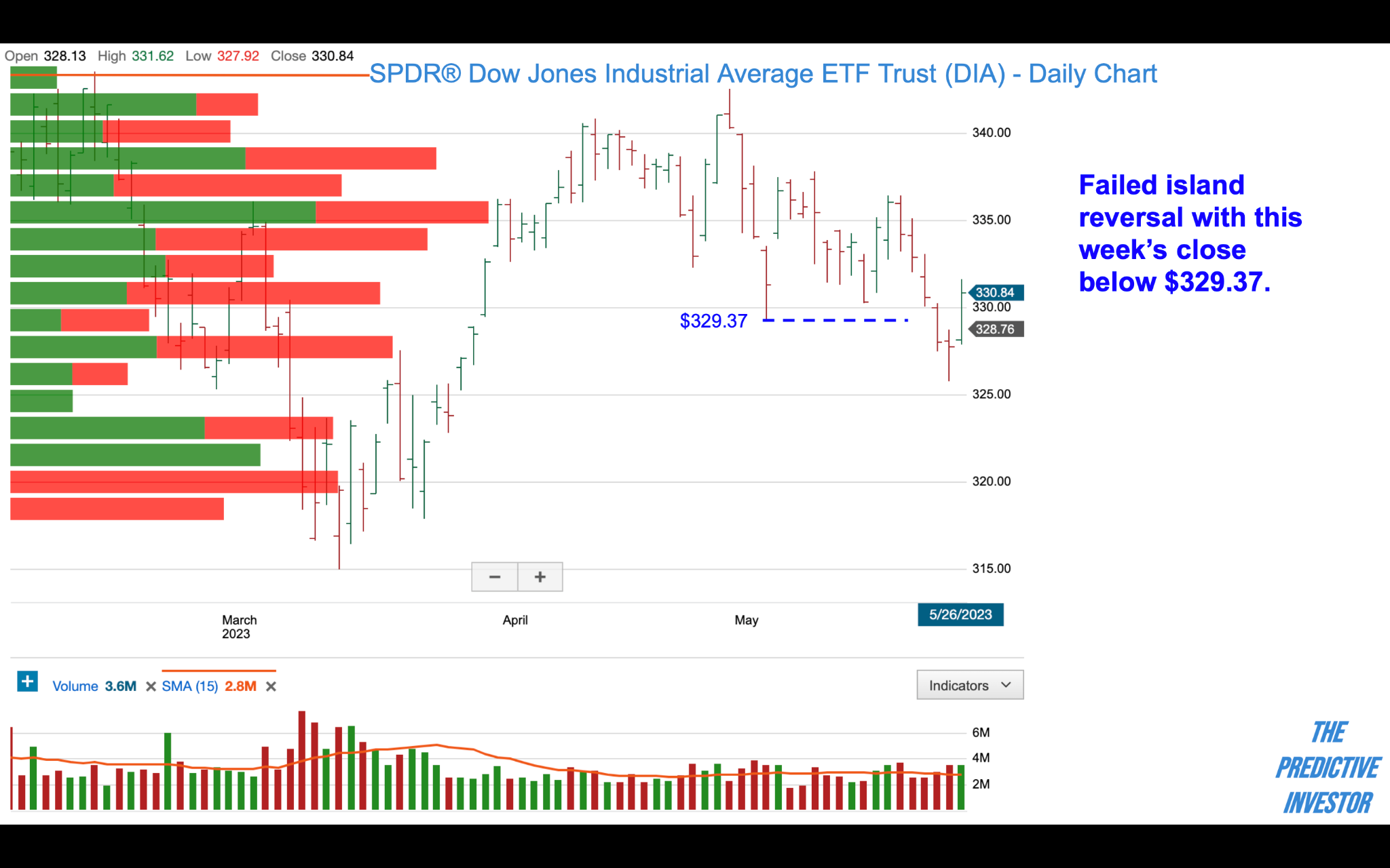 Last week we said DIA was likely to head down to $325 before offering any potential upside, but we didn’t expect that to happen so quickly. On Thursday DIA hit a low of $325.82 before bouncing back and closing just above $330, negating a potential island reversal from May 4. DIA has been in a downtrend all month, making a series of lower highs and lower lows since May 1. Our outlook for DIA continues to be bearish.
