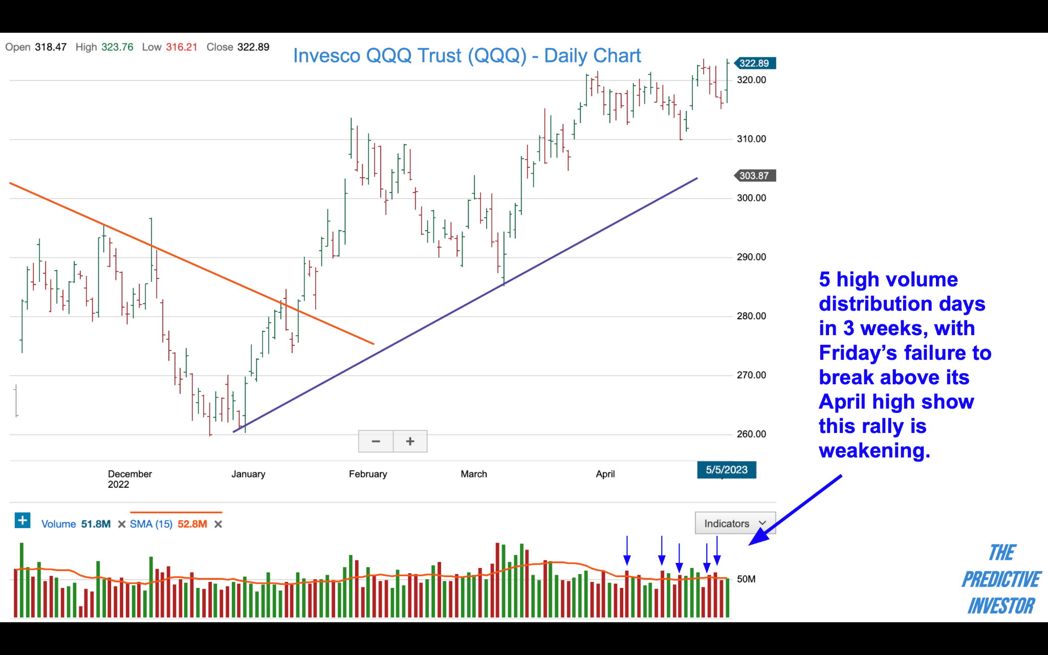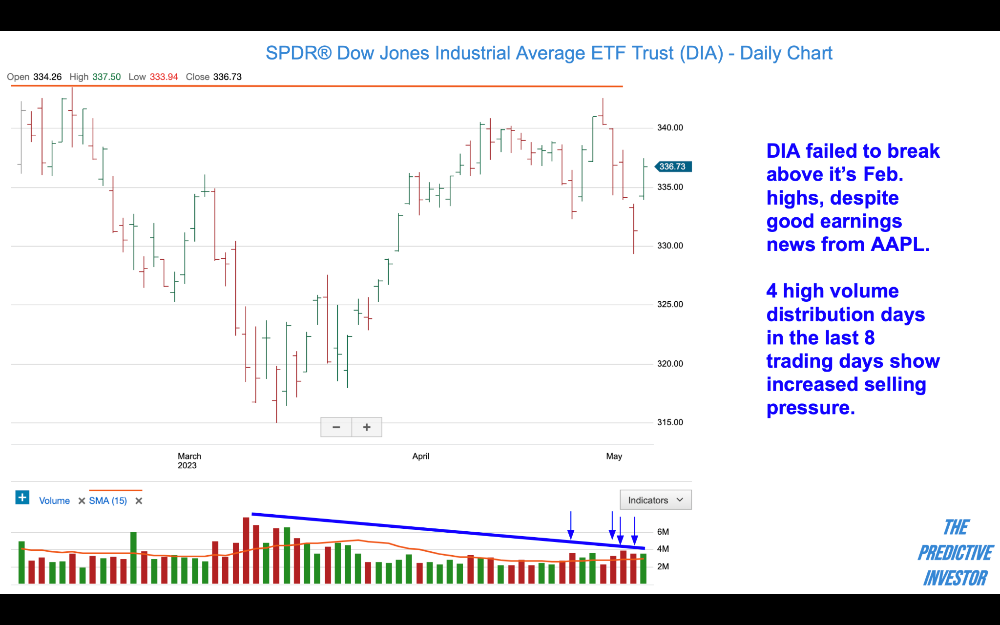 DIA failed once again to break above its February highs. Volume continues to decline in this advance since the March lows, and we’ve seen 4 high volume distribution days over the past 8 trading days.