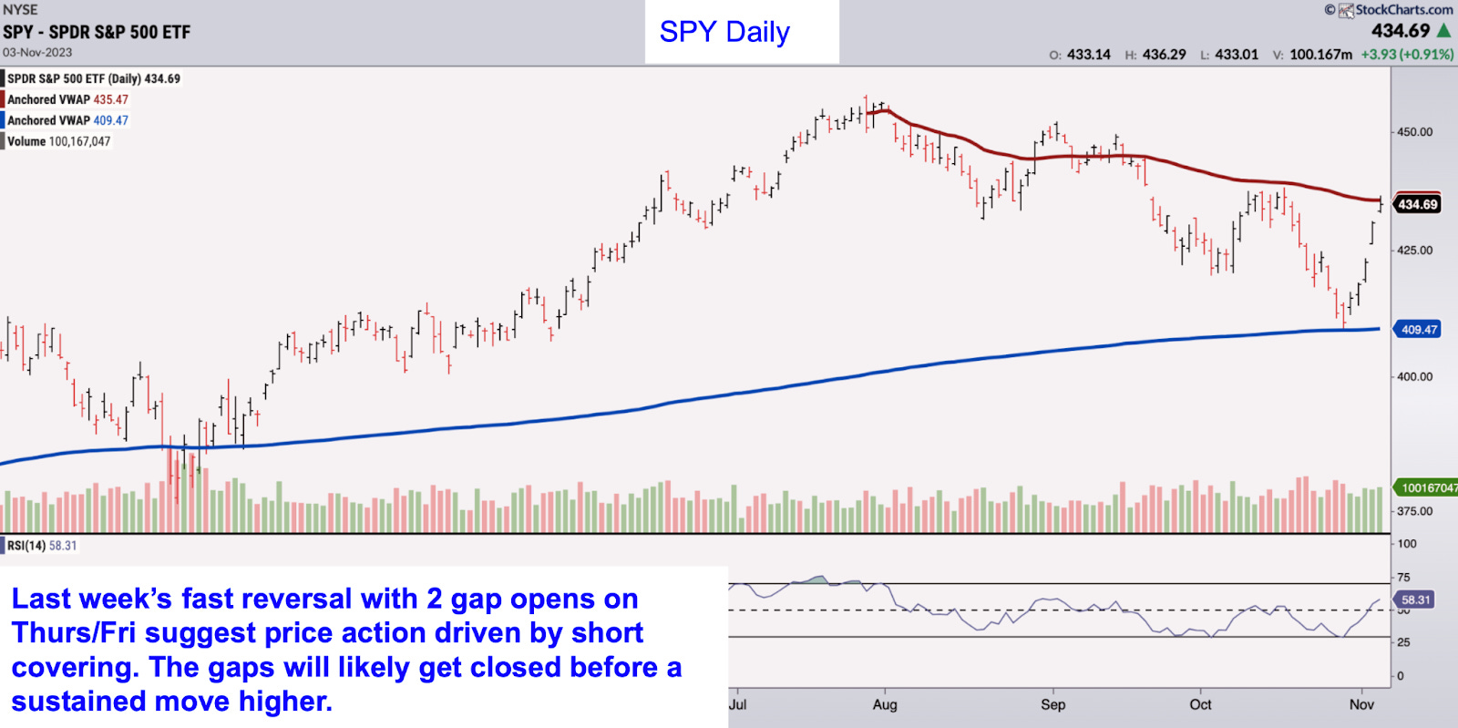 What a rally! We went from support to resistance in 5 days. When the index closed at the 10/13/22 AVWAP last week we said that it was “an area that has seen volume climaxes several times since October 2022. RSI dipped into oversold territory, setting the stage for a potential bottom.” We did see that reversal, but the rapid advance suggests a knee jerk reaction to lower yields that was likely triggered by a wave of short covering. Holding the 10/13/22 AVWAP was important - it means the bull market is still intact. The index is now at resistance. It would be natural to expect a modest pullback that closes either of the gaps created by Thursday and Friday’s opens before a sustained move higher.