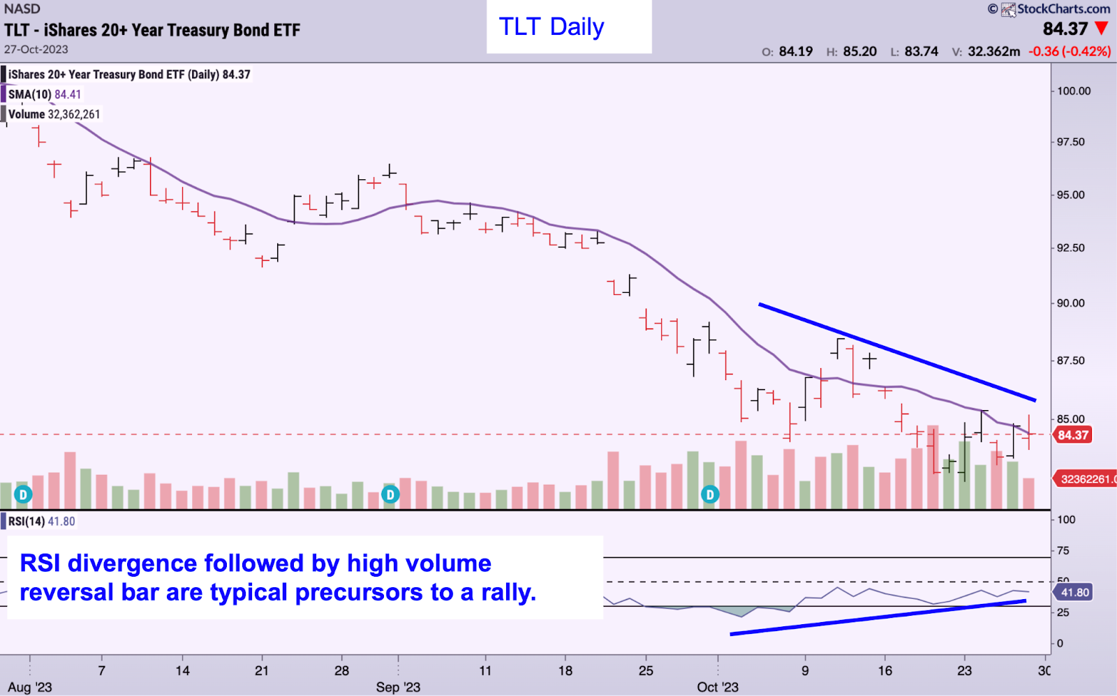 Stocks are oversold and we’re seeing signs that bonds are stabilizing (see below). We’ll be looking for opportunities to add to the portfolio this week. We’ll also be publishing our November Portfolio Review to highlight any opportunities in our existing holdings.