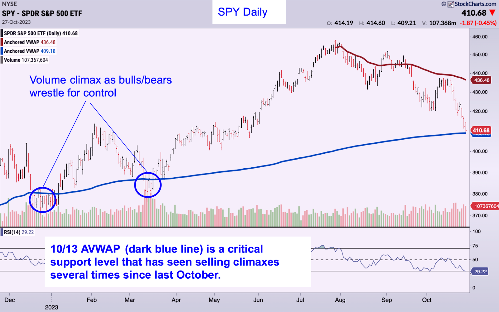 Last week we said if SPY can’t hold its 200 day moving average, “it will trigger a wave of selling that will take it down to the 10/13/22 AVWAP (dark blue line).” This is exactly what happened. We’re now at a critical level of support - the volume weighted average price since the bull market began last October. This is an area that has seen volume climaxes several times since October 2022. RSI dipped into oversold territory, setting the stage for a potential bottom.
