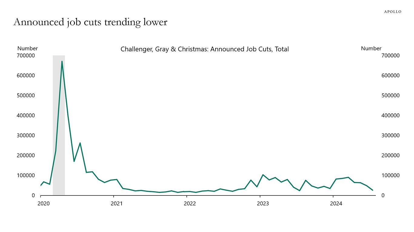 But leading indicators of unemployment do not suggest we’re in for a huge spike. Layoffs remain at a record low, and planned job cuts are trending down.
