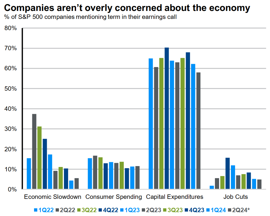 Total corporate capex hit an all time high in Q1. And there are no signs of a slowdown any time soon. Mentions of an economic slowdown and job cuts during Q2 earnings calls are well below their highs from 2022 and 2023. Mentions of capital expenditures remain high, driven by the longer term trends we’ve talked about before: AI, clean energy and the reshoring of supply chains. This represents an optimistic outlook by Corporate America, that should continue to drive economic growth.