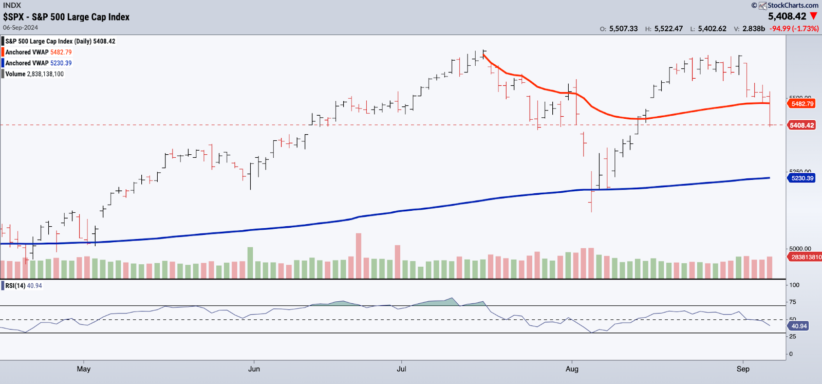 The SPX closed the week below the 7/16 AVWAP (red line), indicating the selloff from that started in July is part of a larger corrective move.