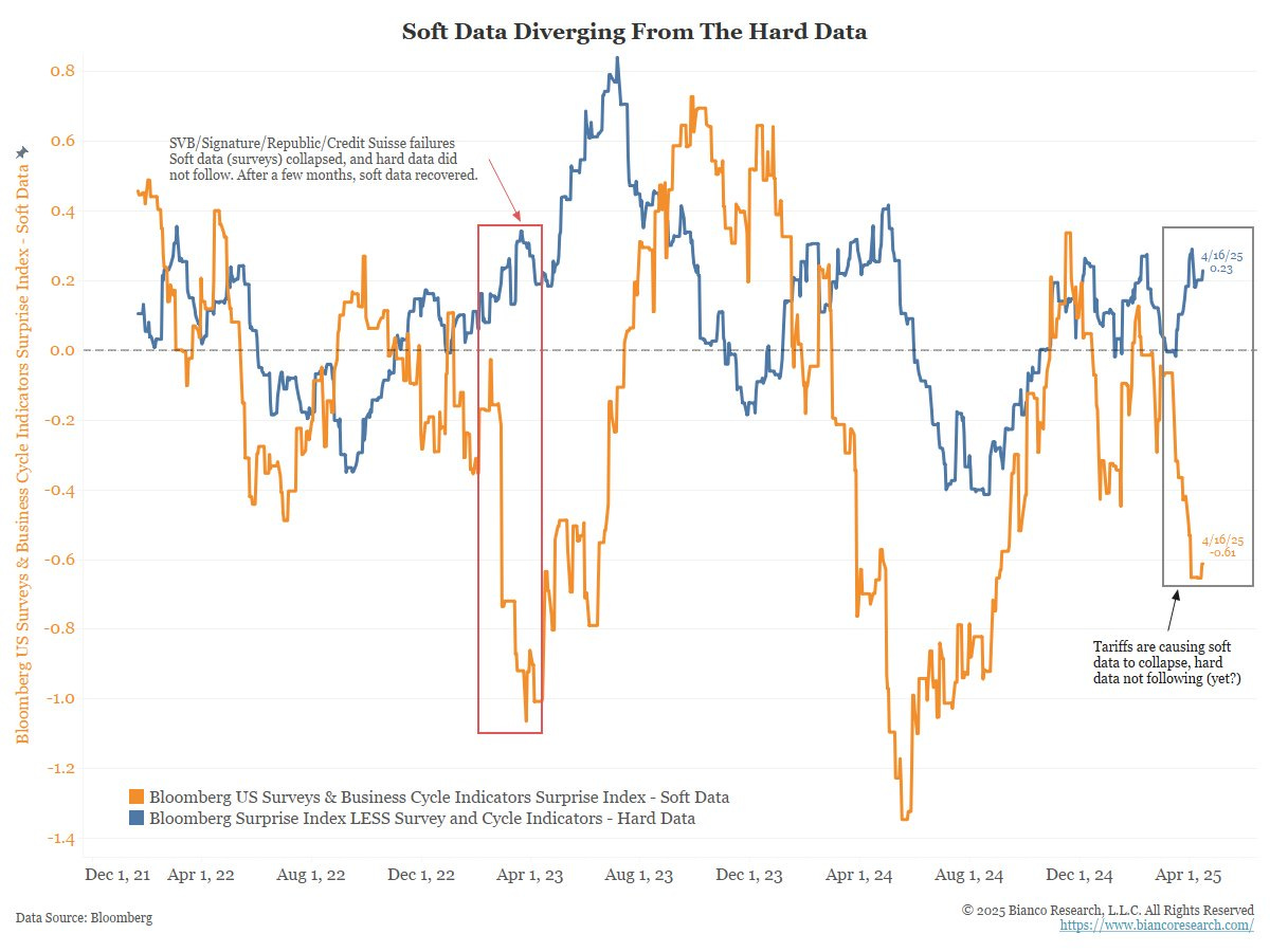 Jim Bianco posted the chart below on X, showing that soft data (i.e. sentiment) typically lags behind hard data. That hasn’t been happening this time around.
