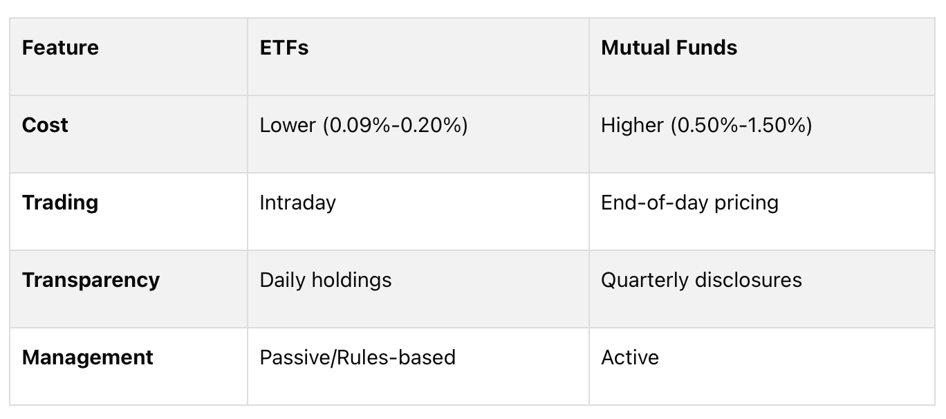 ETFs: Lower fees (0.09%-0.20%), intraday trading, and daily transparency. Ideal for active investors who adjust portfolios frequently.