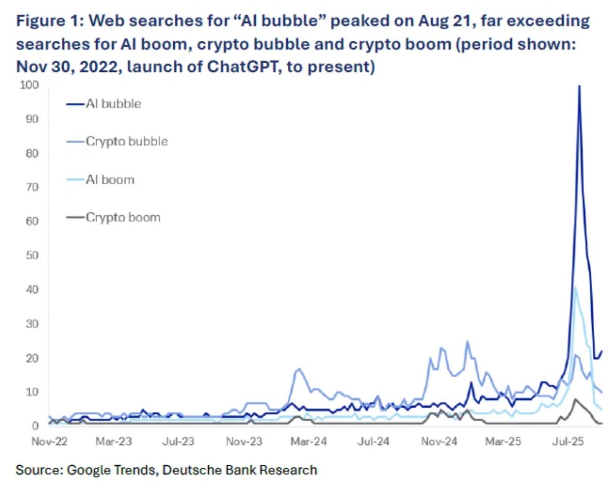 Web searches for “AI bubble” hit a record in August, far outpacing searches for “AI boom.” When more people are worried about downside risk than chasing upside, that’s not the environment where markets typically top.