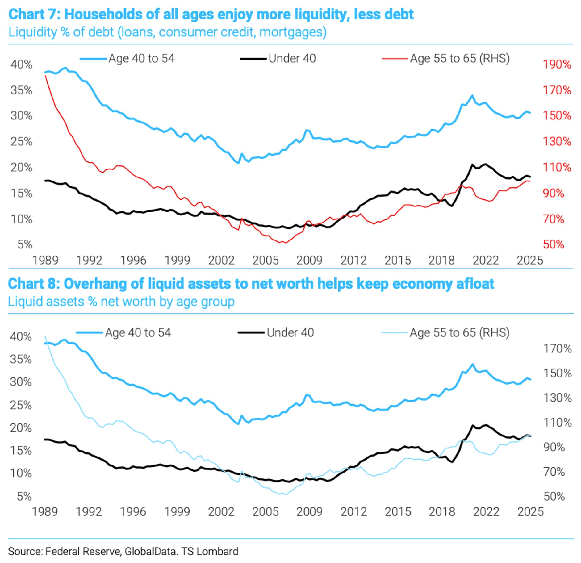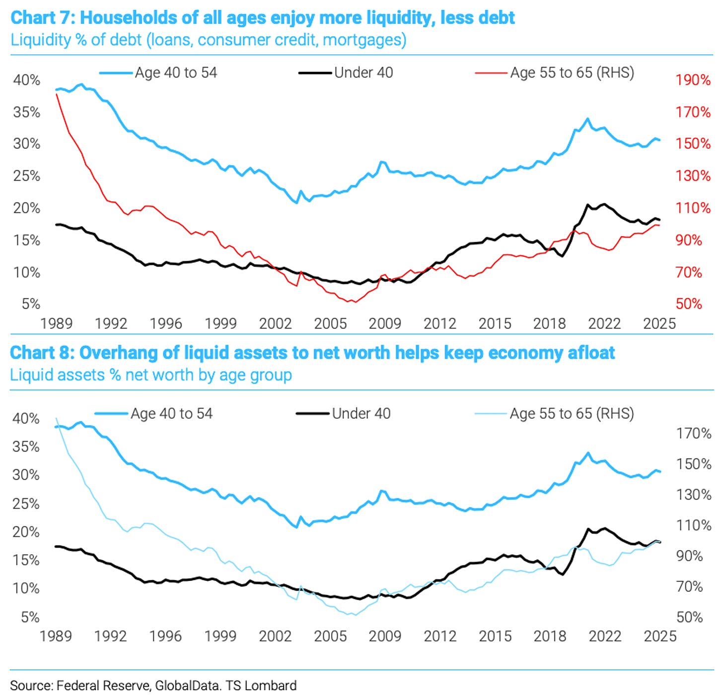 Despite the perception that households are stretched, the data say otherwise. U.S. households still hold a large amount of liquidity relative to debt. And money market funds hold nearly $8 trillion in assets. That dry powder suggests the retail side hasn’t maxed out yet.