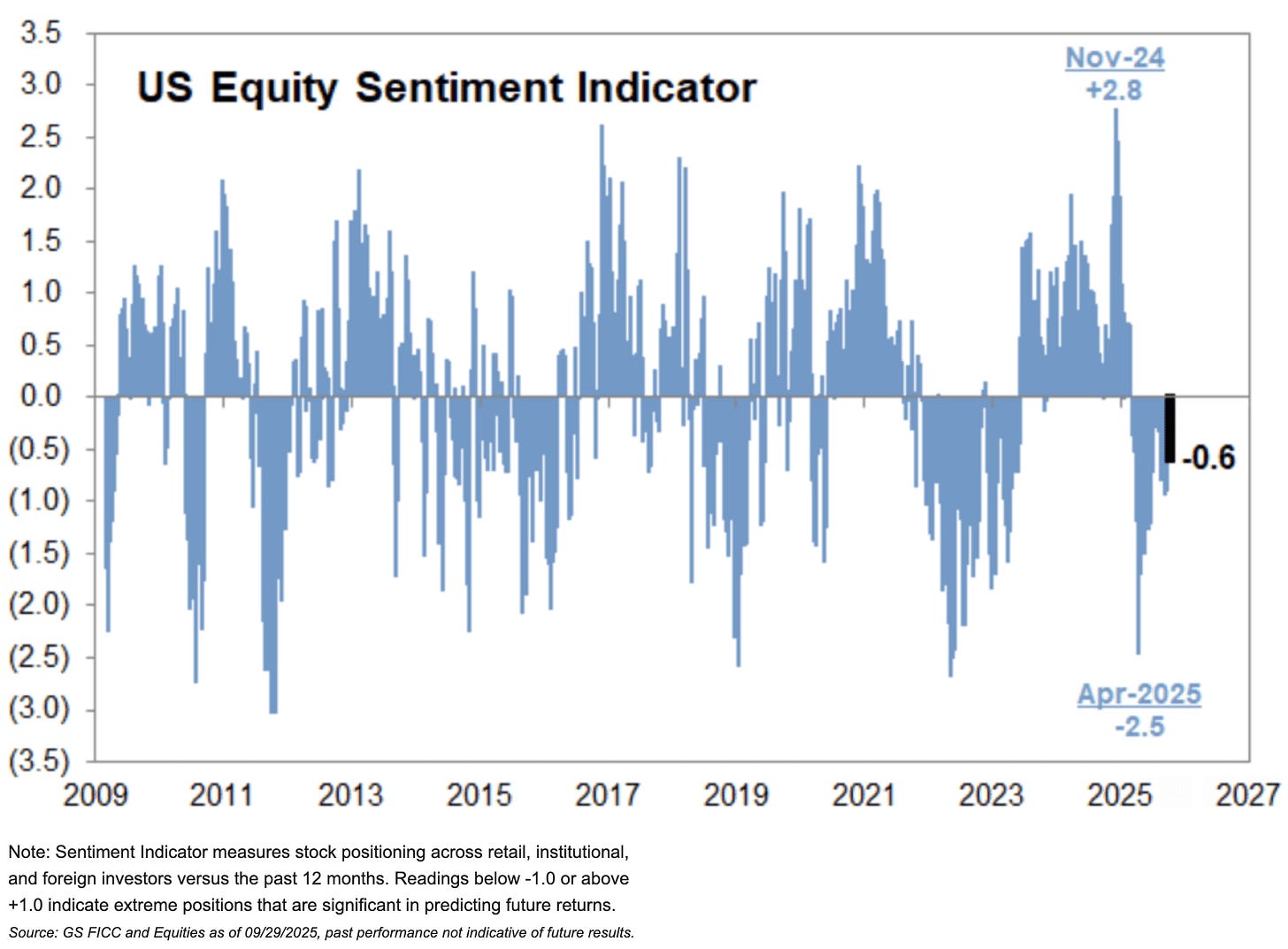 Goldman’s U.S. Equity Sentiment indicator sits at -0.6, showing that institutional positioning in equities is still low. In other words, the big money is far from all-in, a clear sign we’re not at peak exuberance.