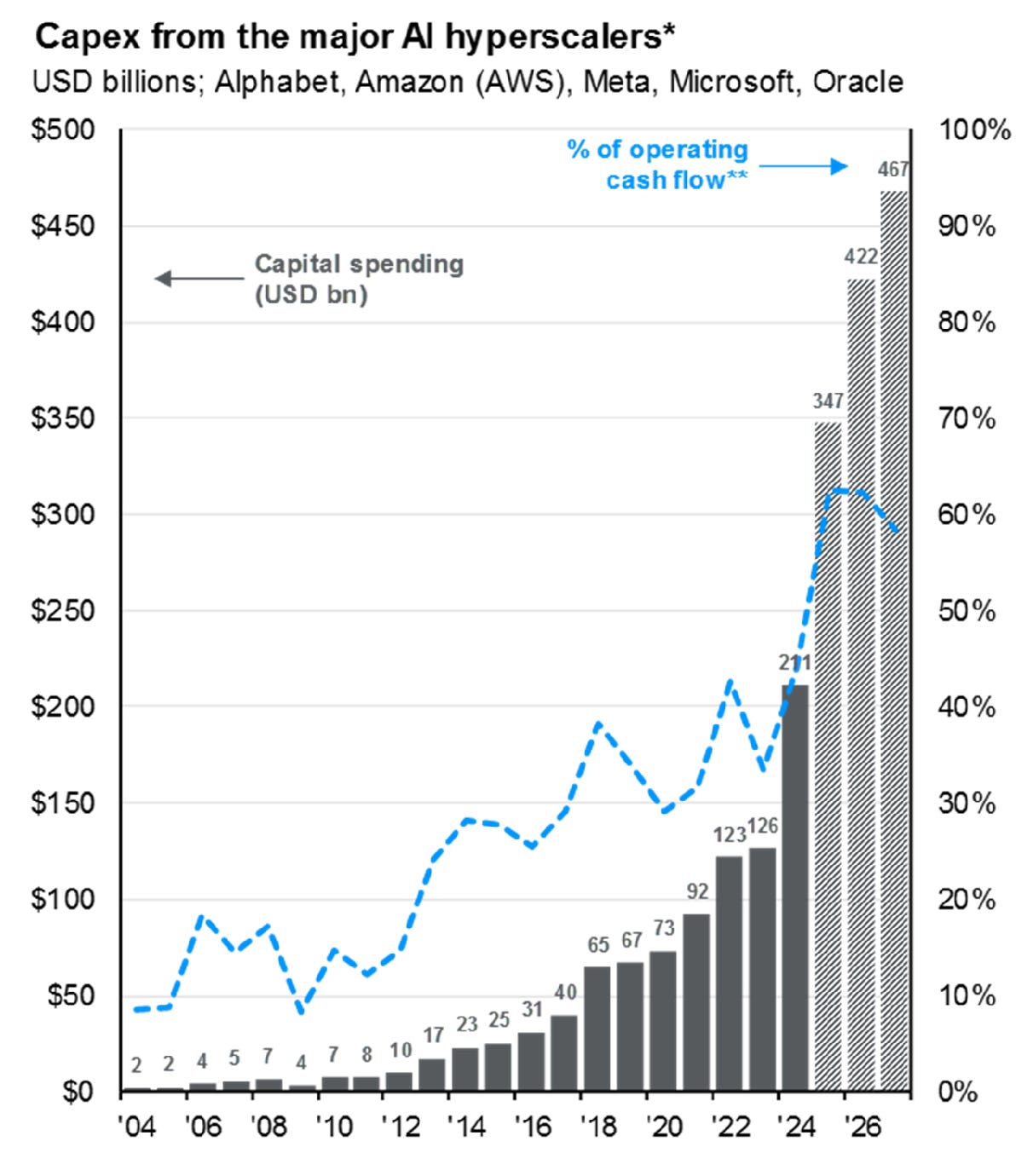 JPMorgan estimates the top five mega-cap tech leaders will spend a combined $1.2 trillion on Capex between 2025 and 2027. Will they earn a return on that investment? That remains uncertain. But what is certain is the ripple effect: utilities to power data centers, industrial reshoring to support supply chains, and massive growth in data services. This isn’t just a tech story, it’s a broad, economy-wide growth cycle.