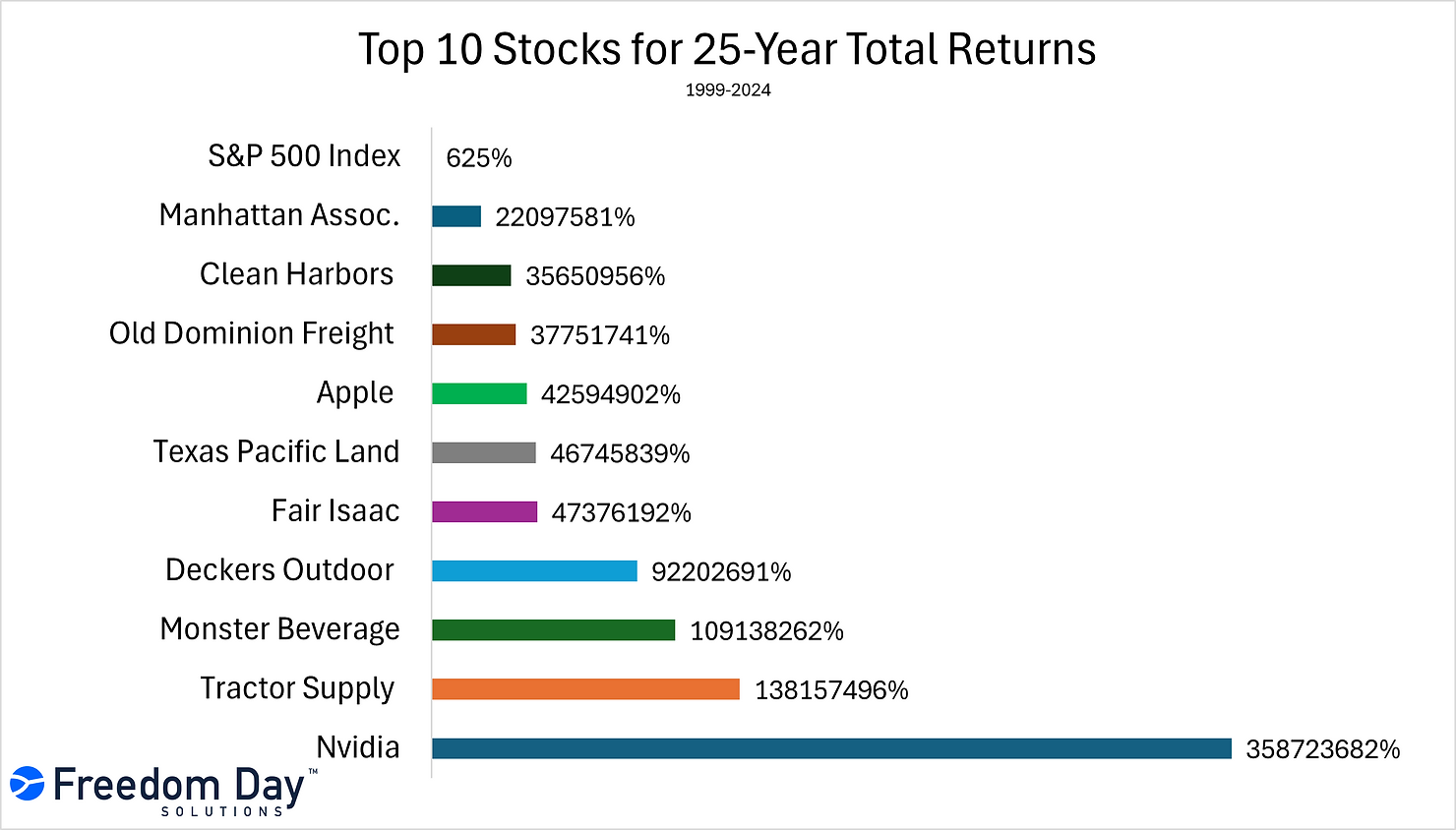 Freedom Day Solutions published a blog post that looked at the top 10 biggest winners over the last 25 years. Only two of the top 10 are Mag 7 stocks.