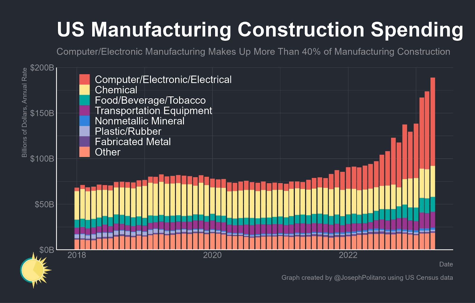 A few weeks ago I highlighted the recovery in manufacturing jobs. And the construction of manufacturing facilities shows no signs of slowing down. The biggest gains have come from computer/electronic manufacturing and transportation equipment.