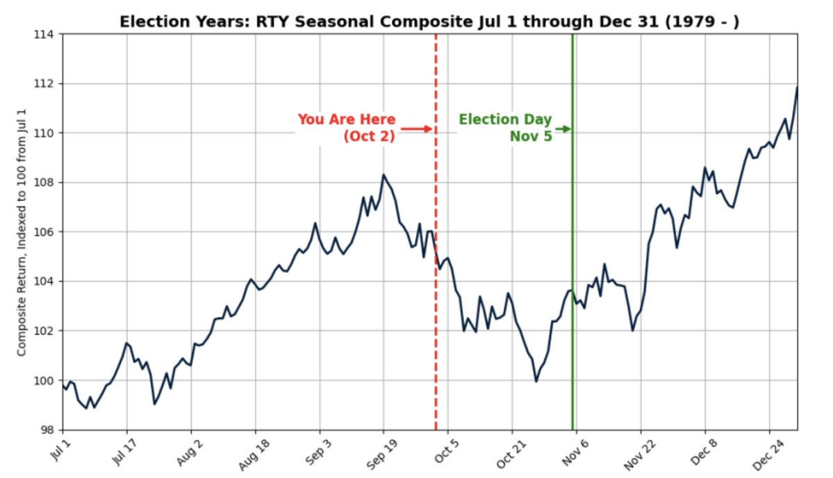 Let’s now take a look at seasonality for the companies we focus on. The pullback we’ve seen in the Russell 2000 since mid-September is normal for an election year.