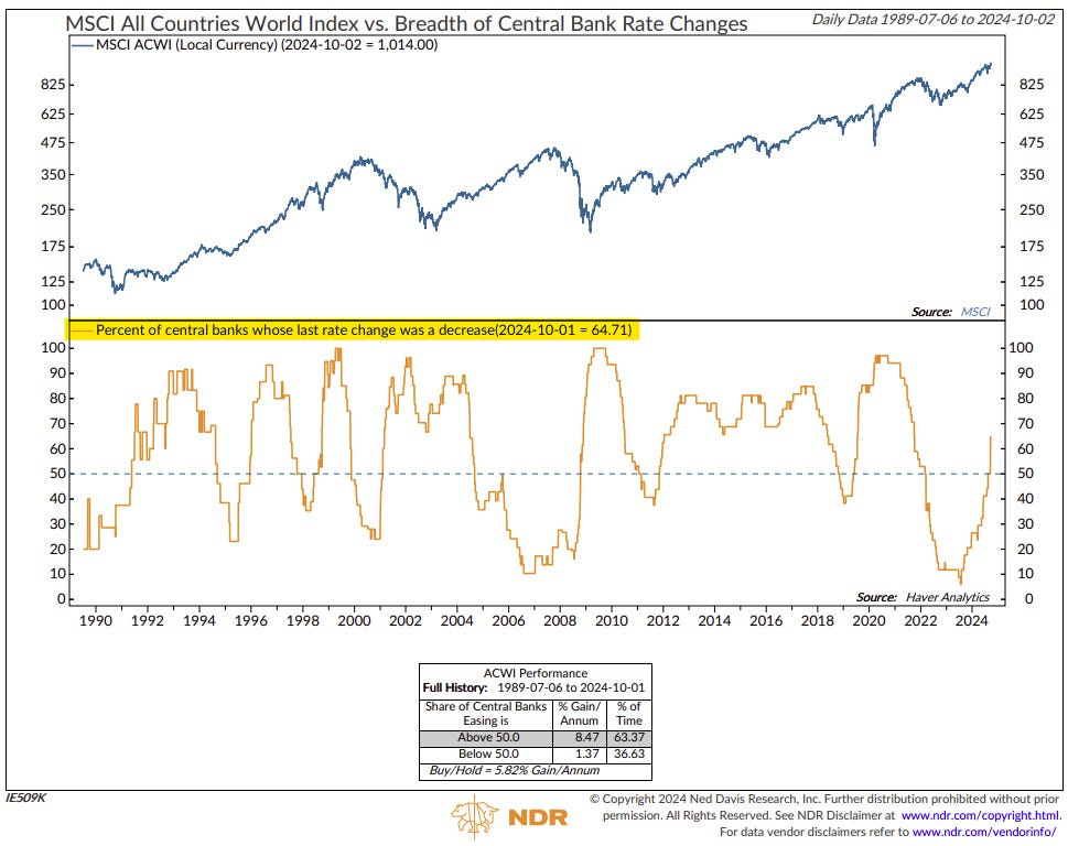 Historically when more than half the central banks are easing, global equities averaged gains of 8.47% per year.