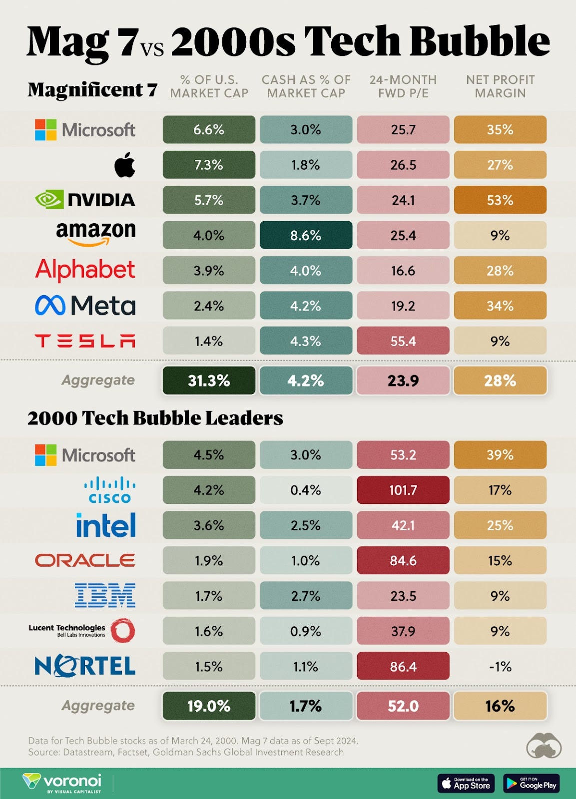 At least not yet. This great comparison from Visual Capitalist ranks the Mag 7 against the equivalent market leaders of the dot com tech bubble. The Mag 7 are trading at less than half the valuation and have nearly double the profit margins than the tech bubble leaders did.