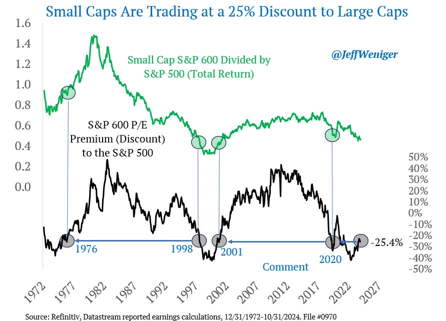 Last week the S&P 600 closed at a new all time high. And yet it’s still trading at a 25% discount to the S&P 500, a level seen at several other market bottoms.