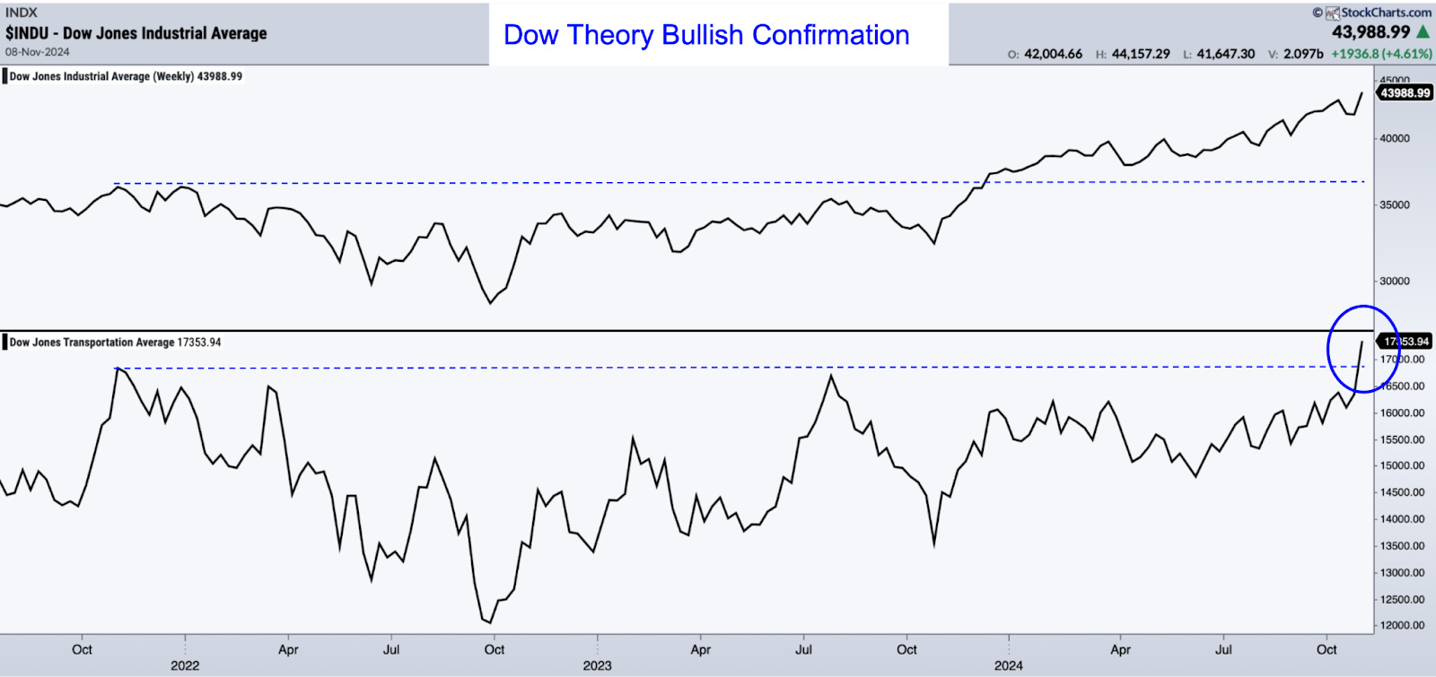 Many technical analysts were skeptical of this bull market because when the Dow Industrials broke above its 2022 high in December 2023, the Dow Transports remained below its all time high for months. That changed last week.