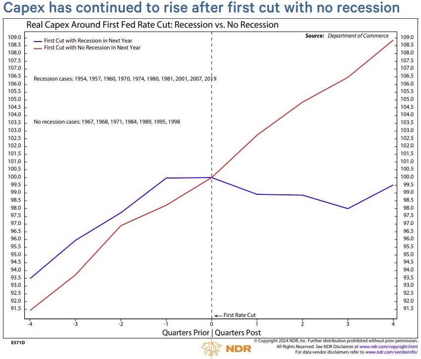 Capex growth will continue through next year, driven by AI, infrastructure and reshoring supply chains. This is in line with previous rate cut cycles. In years when there was no recession, capex growth surged after the first Fed rate cut.