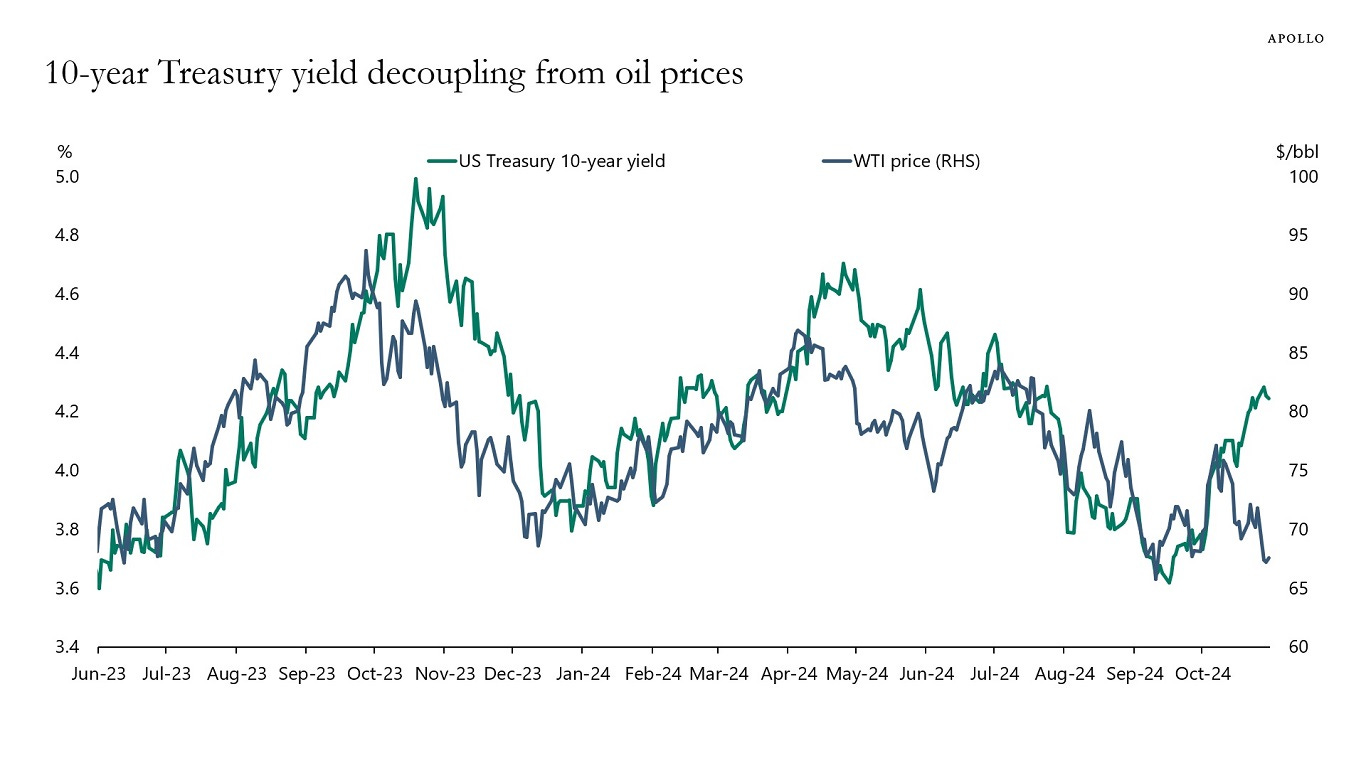 There’s been a divergence between oil and the 10-year yield since the Fed cut rates back in September. Historically yields and oil are positively correlated, since falling oil prices are disinflationary, which is bullish for bonds (and vice versa).