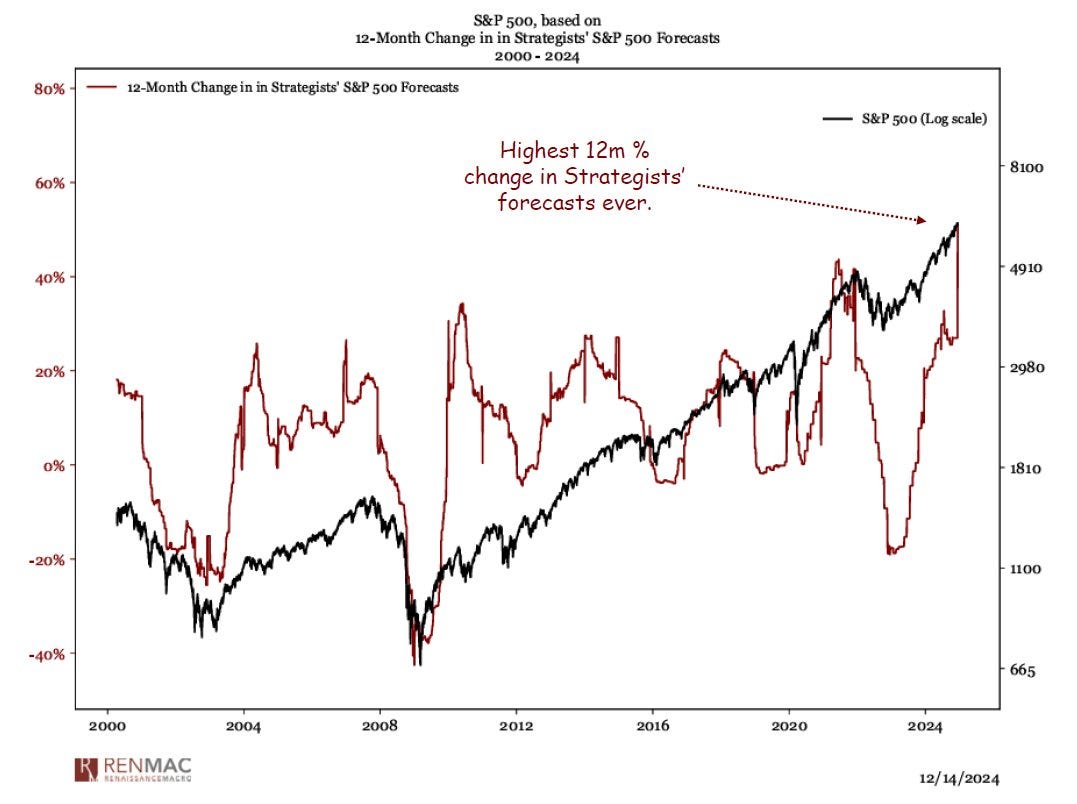 Wall Street strategists were caught off guard by this runaway bull market, and they don’t want to continue being wrong. What we’re seeing now is the highest 12-month increase in Wall Street market forecasts in over two decades. Unanimous consensus tends to create an environment that’s ripe for surprises.