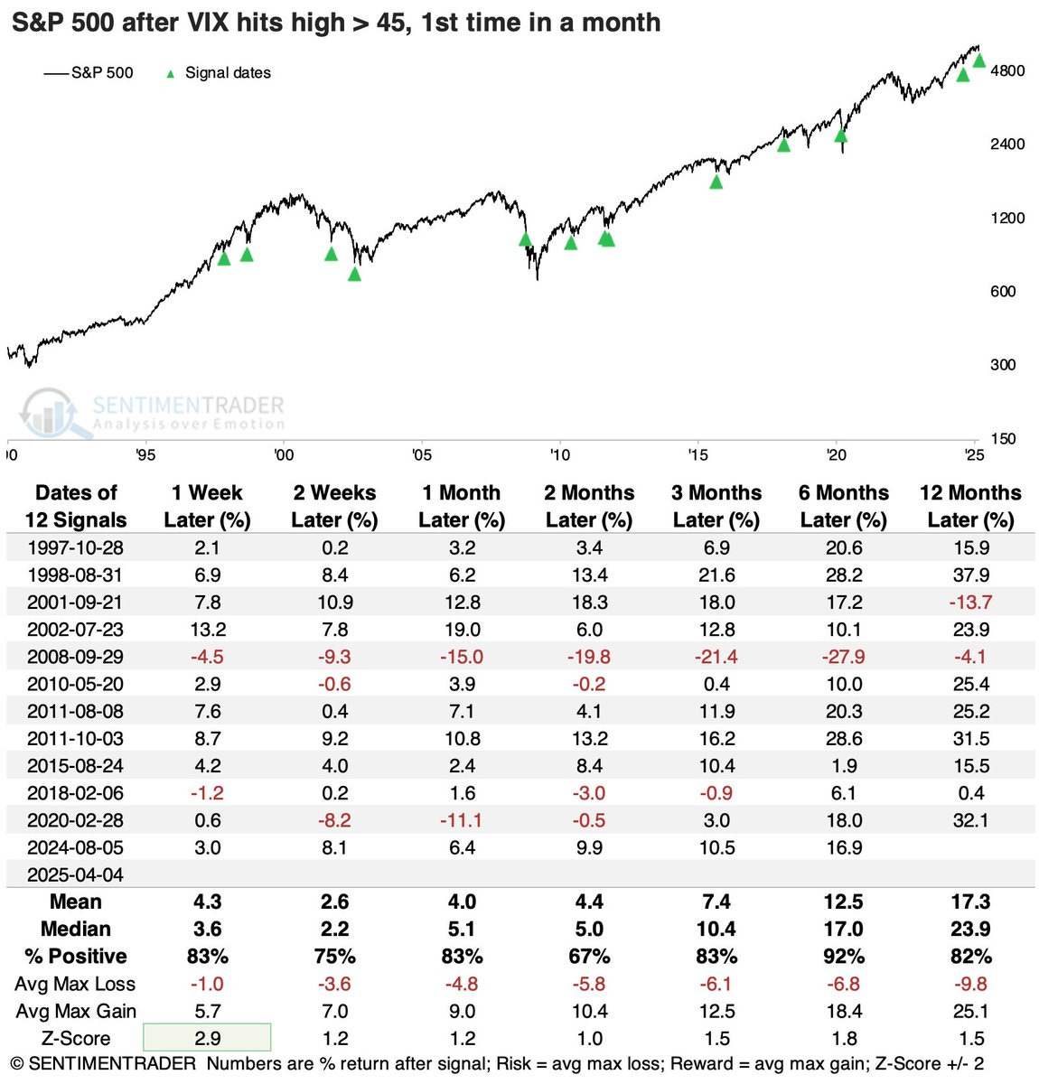 The VIX jumped to levels seen during prior market panics. SentimenTrader analyzed forward returns for the S&P 500 after the VIX closed above 45. In most time periods, the index was higher.